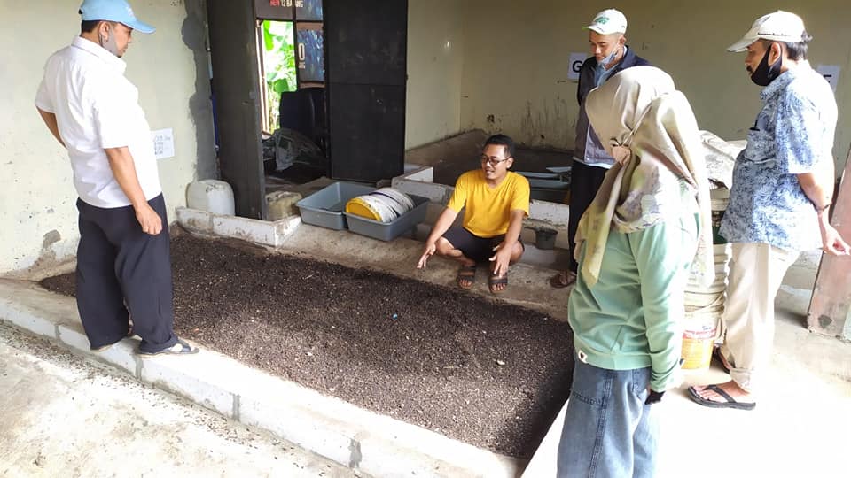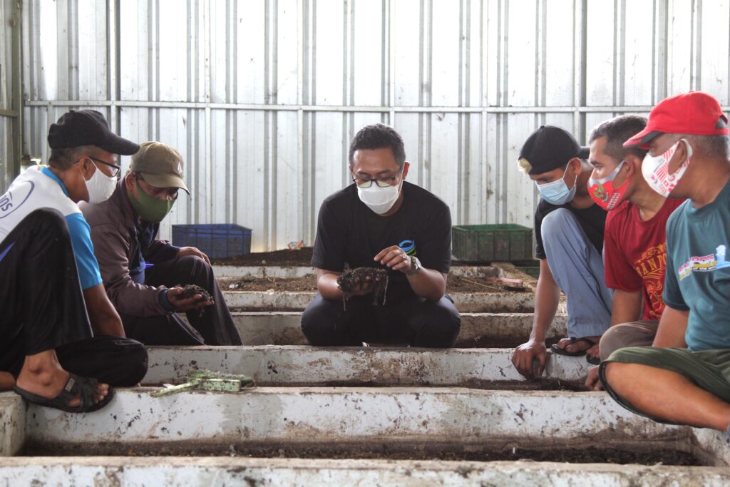 Arky Gilang Wahab (tengah), warga Desa Banjaranyar, Sokaraja, Kabupaten Banyumas, Jawa Tengah sebagai penggagas budidaya Larva Maggot pengedukasi karyawan Bumdes tentang budidaya Larva Manggot di TPST Sokaraja, (3/9/21). (Foto : Budi Purwanto)